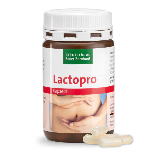 Nutritional supplements with selected probiotic bacteria and zinc. Each Lactopro Capsule contains at least 1 billion lactic acid bacteria of the following strains: Bifidobacterium bifidum, Bifidobacterium longum, Lactobacillus casei, Lactobacillus plantarum, Lactobacillus rhamnosus. The enteric-coated capsule guarantees that the bacteria strains contained are released separately in the digestive tract and thus get directly to the intestinal flora. Among other things, zinc is important for a functioning immune system and contributes to a normal acid-base balance, carbohydrate metabolism and fatty acid metabolism. Lactopro is free of gluten, yeast and lactose. Ingredients: Rice starch, hydroxypropylmethyl cellulose, inuilin, lactic acid bacteria (Bifidobacterium bifidum, Bifidobacterium longum, Lactobacillus casei, Lactobacillus plantarum, Lactobacillus rhamnosus), zinc gluconate, separating agent Magnesium stearate, thickener gellan.