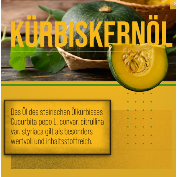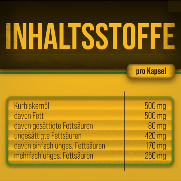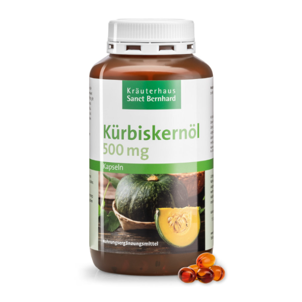 Maintain a healthy prostate function and support bladder health. The oil of the ingredient-rich pumpkin Cucurbita pepo L. convar. citrullina var. styriaca from organic cultivation in Styria/Austria is regarded as especially valuable. Pumpkin Seed Oil Capsules support healthy bladder and prostrate function and contribute, especially after longer application to a normal function of the urinary organs. Ingredients: Pumpkin seed oil (73%)*, gelatin, glycerin humectant, antioxidant, Tocopherol extracts of natural origin. * Certified organic. EN-ECO-001. 82% of the ingredients of agricultural origin have been produced according to the basic rules for organic farming. Each capsule contains 500 mg of pure pumpkin seed oil from the seeds of ripe pumpkins.