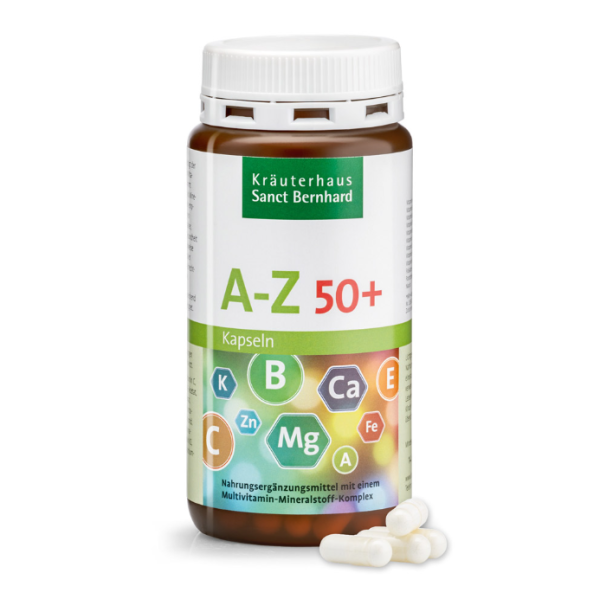 A-Z capsules 50+ contain all vitamins, mineral nutrients and trace elements which our well-tried A-Z capsules also comprise. In addition, however, chosen micro nutrients such as vitamin C, folic acid, vitamin B6, vitamin B12 and chrome were added which correspond to the changed energy requirement of the elderly.